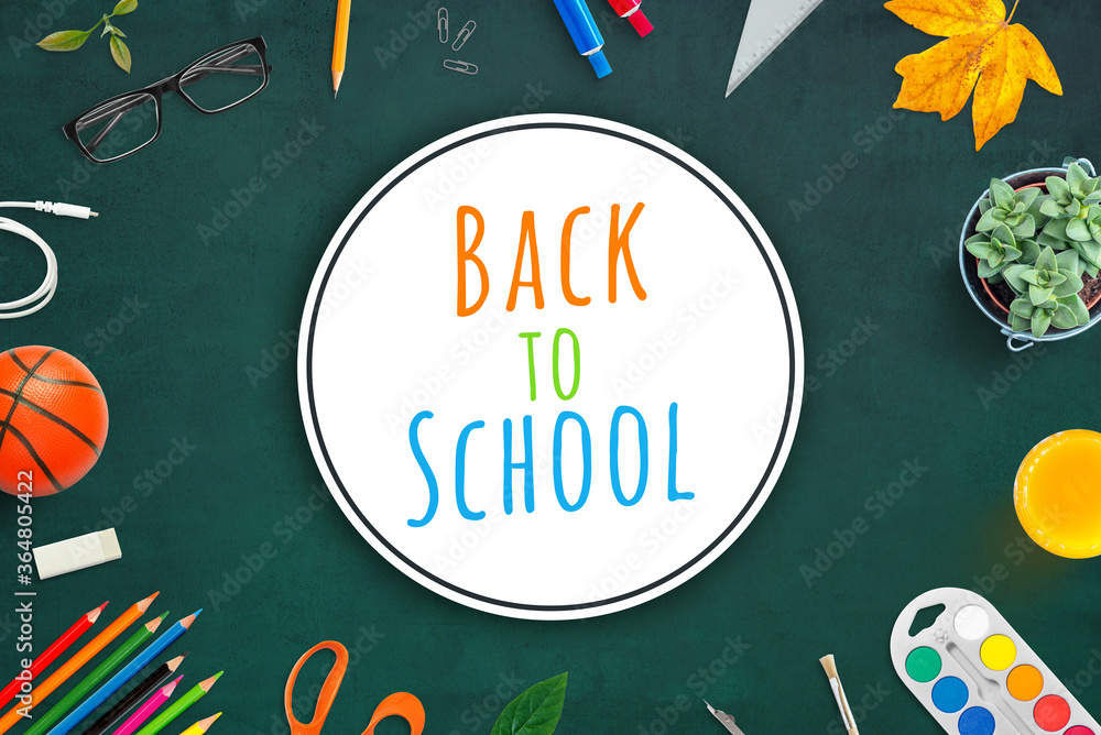 Back to school composition in white circle on chalkboard surface surrounded by school supplies, toys and snack