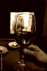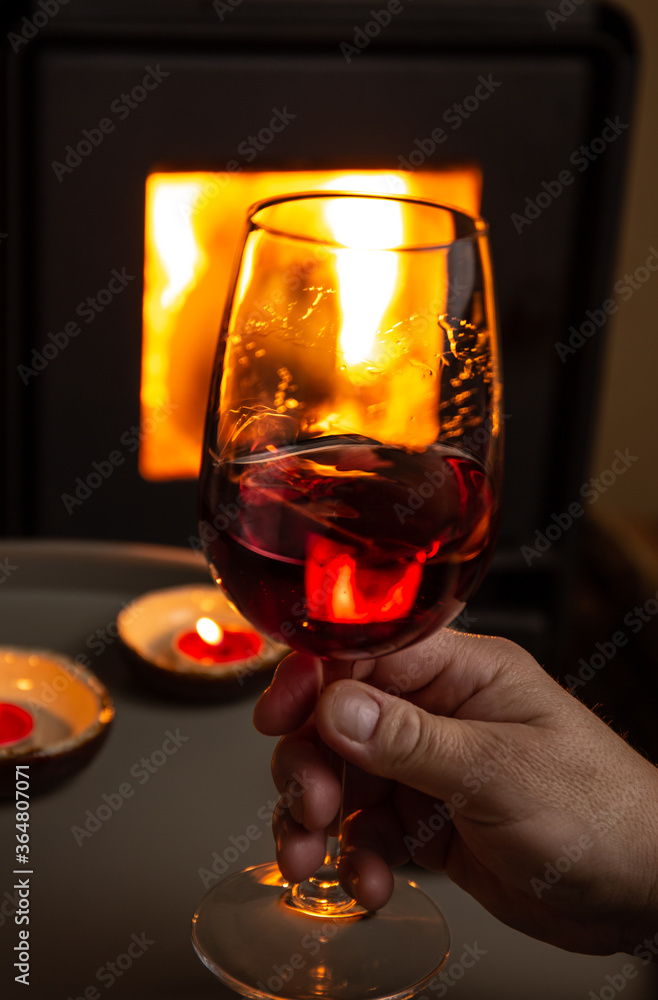 Man hold a glass og red wine front of fireplace. Romantic light