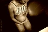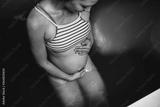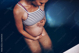 Beautiful pregnant woman floating in tank filled with dense salt water used in meditation, therapy, and alternative medicine.