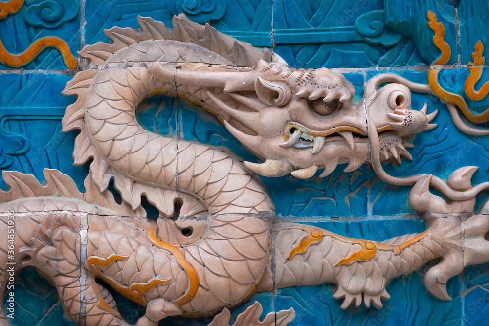 A Nine-Drgon Screen at Beihai Park, composed of 9 diferent Chinese Dragons found in Chinese imperial palaces and gradens