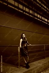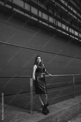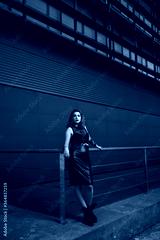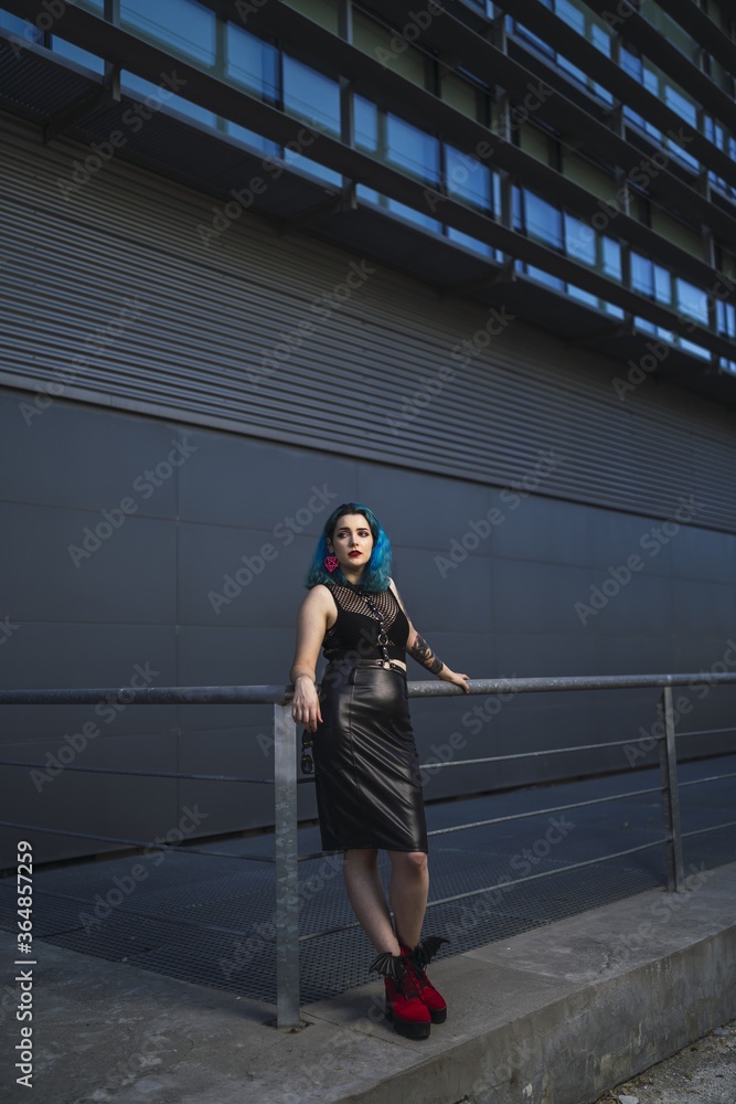 European female with tattoo and blue hair wearing sunglasses and sexy black dress posing
