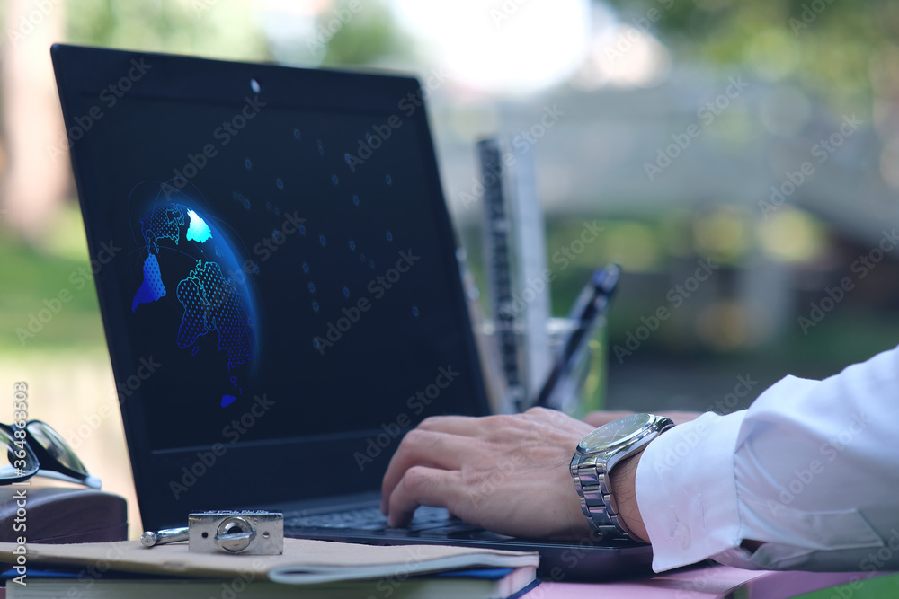 businessman using laptop computer and data technology concept, double exposure