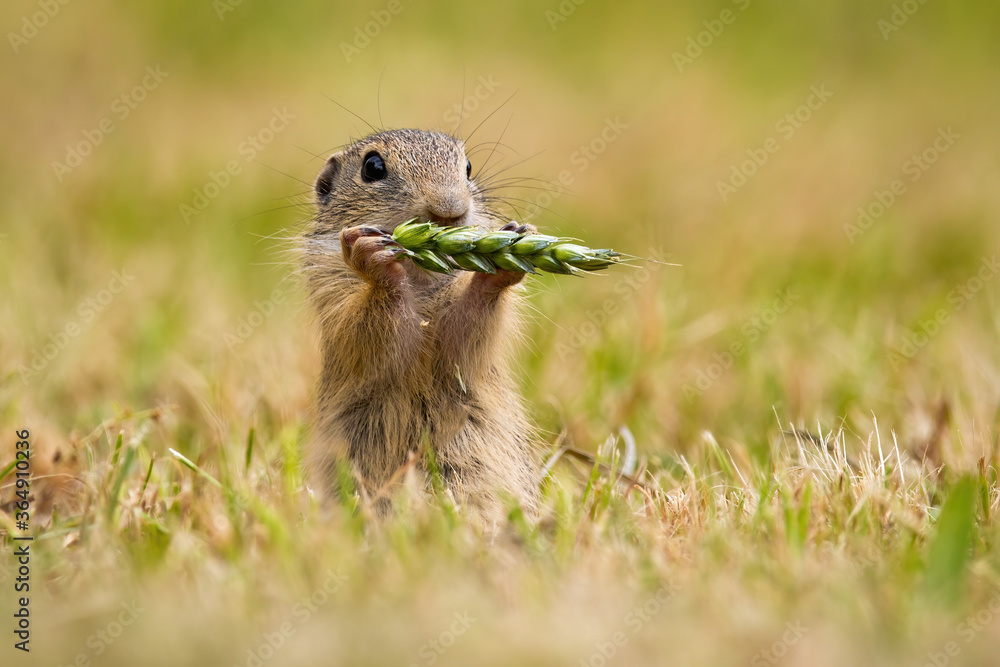 European ground squirrel, spermophilus citellus eating ear on field in summer. Little animal holding wheat. Souslik sniffing spike in agriculturual country.
