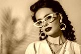 Summer fashion portrait of beautiful curly woman with fuchsia color lips makeup, wearing trendy yellow sunglasses, big earrings, chains, posing on yellow background. Copy, empty space for text