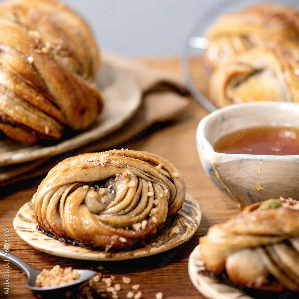 Traditional Swedish cardamom sweet buns Kanelbulle on plate, ingredients in ceramic bowl above on wooden table.