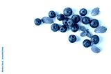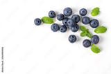 Blueberry fruit top view isolated on a white background, flat lay overhead layout with mint leaf, healthy design concept.
