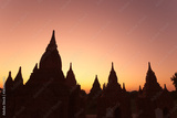 Silhouette of Buddhist Pagodas at sunrise, Bagan, Myanmar..