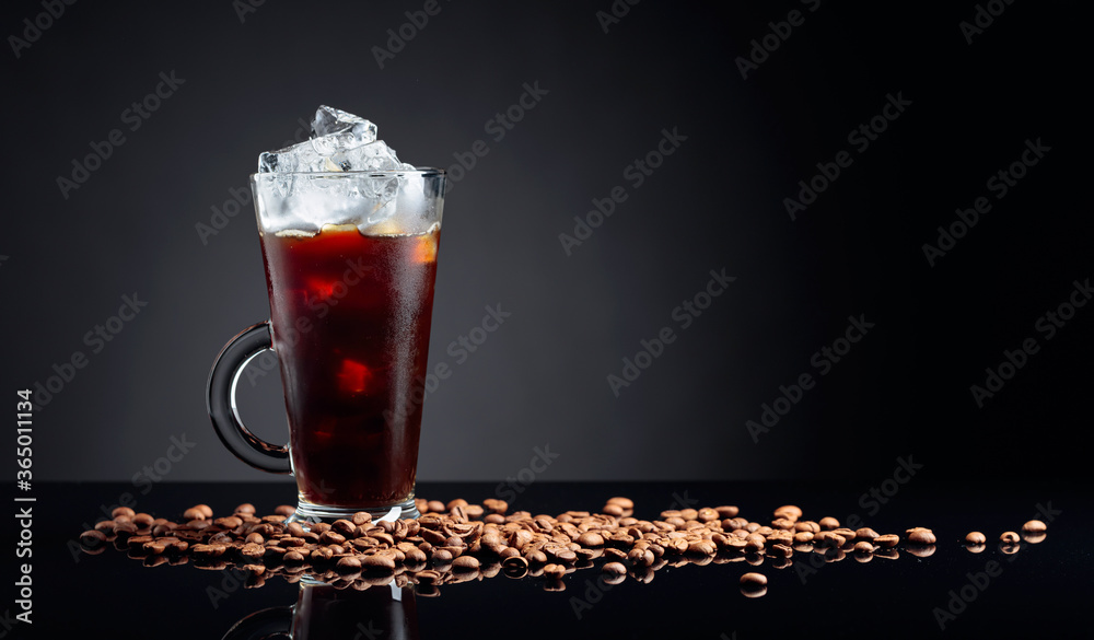 Ice coffee in frozen glass and coffee beans on a black reflective background.