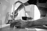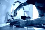 Close up of hands of aged repairman in uniform working, fixing broken kitchen tap using adjustable wrench. Repair service concept