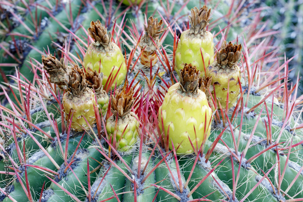 Blooming Ferocactus Wislizeni Cactus in Arizona Cactus Garden