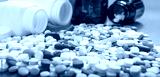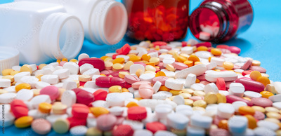 Medical pills and tablets spilling out of a drug bottle on blue background