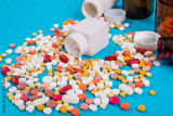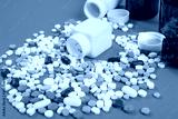 Medical pills and tablets spilling out of a drug bottle on blue background