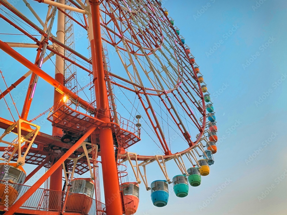 Giant Red Ferris Wheel with Colourful Carriages Against a Blue Sky, in Odaiba Palette Town (Tokyo, Japan) - The Daikanransha Ferris Wheel is 115 Metres Tall