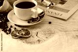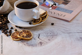 coffee cup and coffee beans on old wood table background, space for text