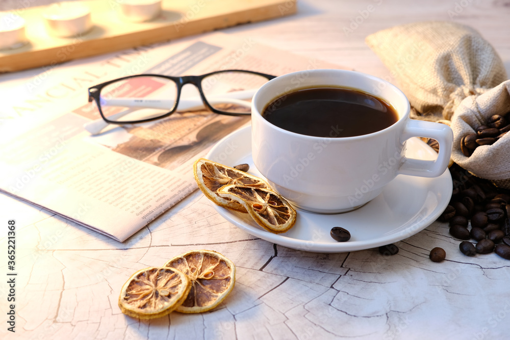 Top view coffee cup and coffee beans on wooden table background and space for text