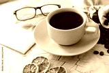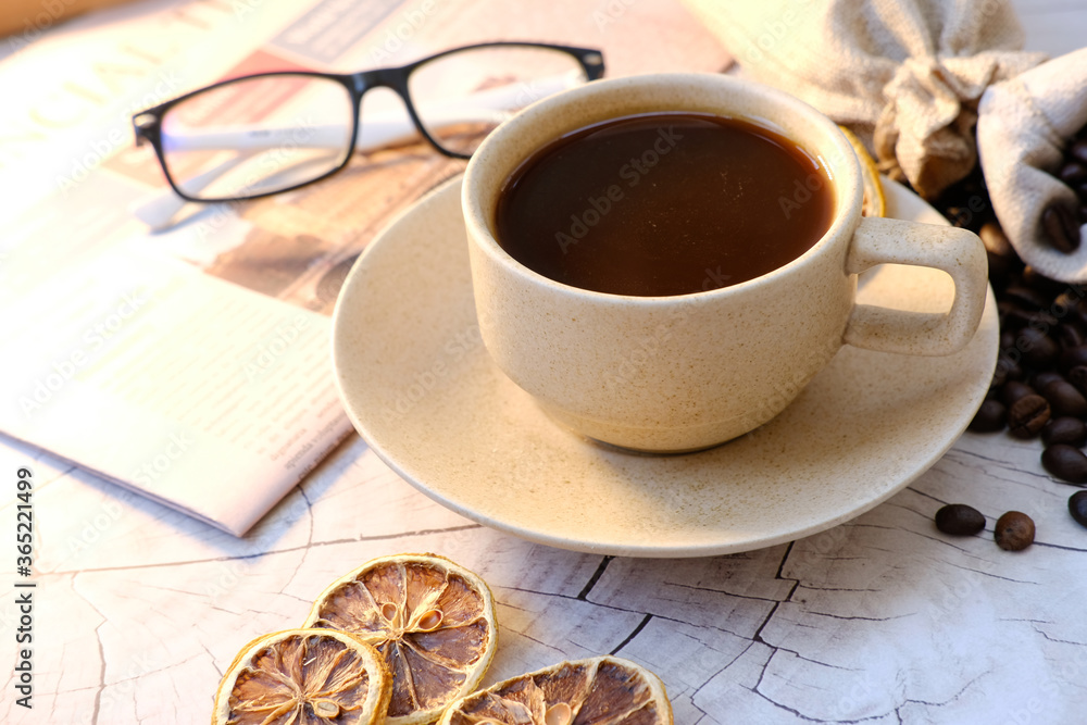 Top view coffee cup and coffee beans on wooden table background and space for text