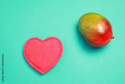 Top view of red heart and near one mango isolated on green background with copy space.Flat lay