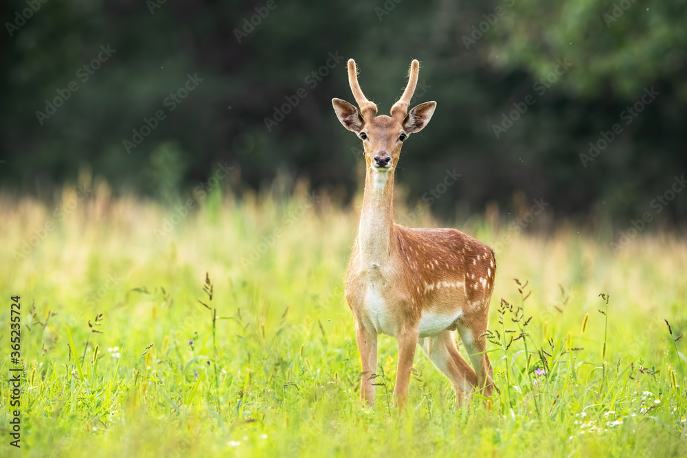 Young fallow deer, dama dama, stag standing on meadow in summer nature. Juvenile animal with antlers in velvet and white spots looking to the camera on grass. Wild mammal watching on pasture.
