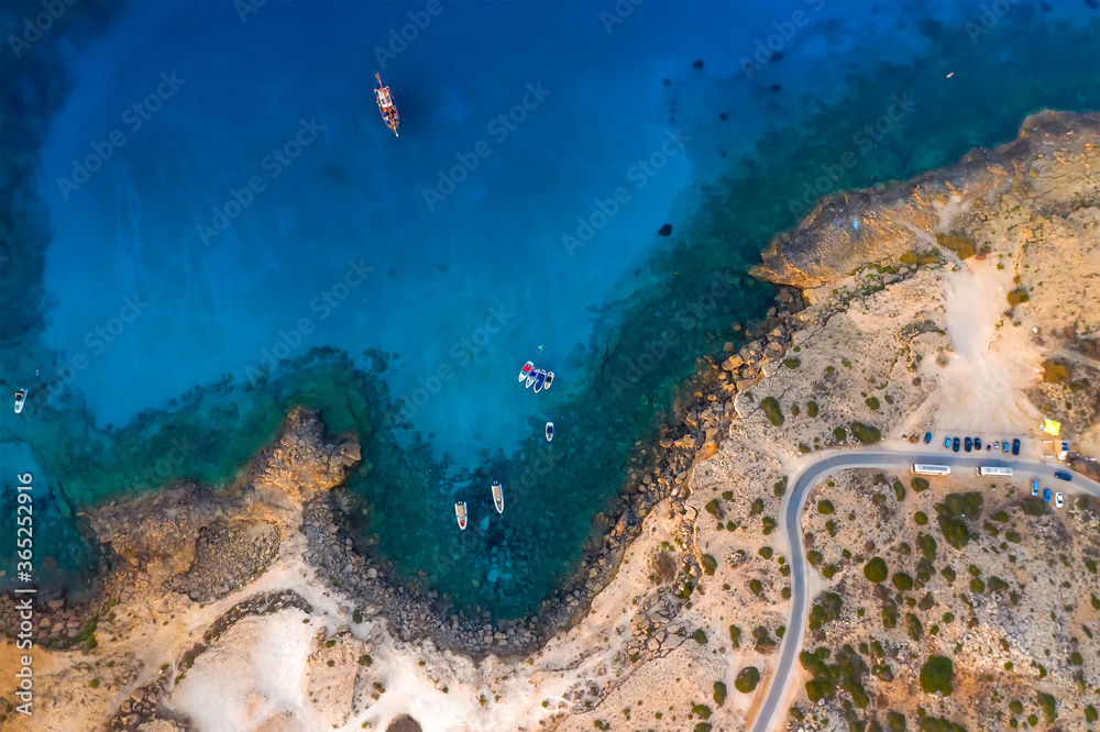 Serene sea bay with fishing boats, top view