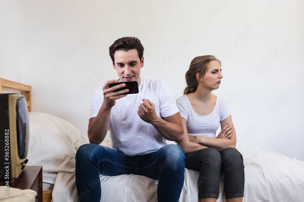 Unhappy & stressed young married couple. Angry offended sullen marriage with depression and disappointtd after argument. Conflict, crisis & trouble relationship problem of lover or marriage family