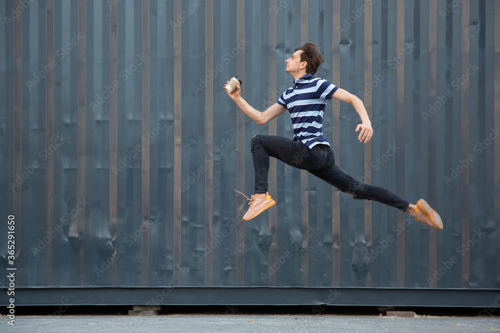 Jumping young buinessman in front of city building wall, on the run in jump high. Drinking coffee, moving to daily routine inspired and sportive. Young ballet dancer in casual clothes and sunshine.
