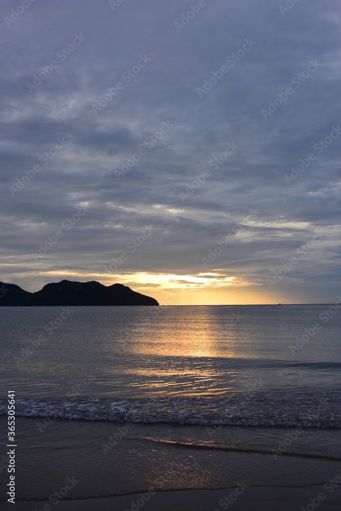 Early morning sea view. The sunrise view against the golden yellow sky