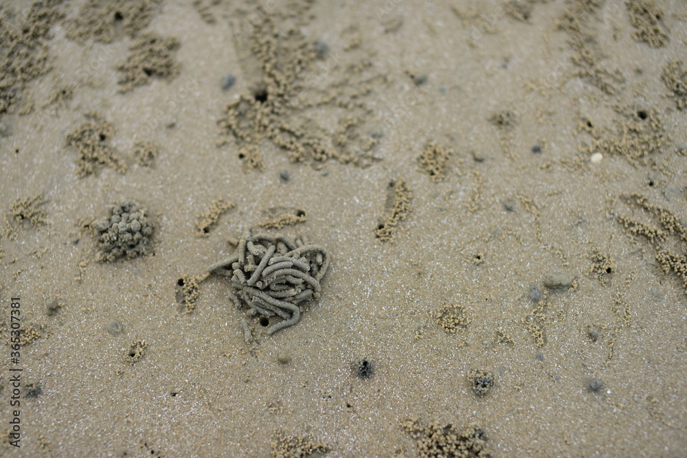 Crabs feces on the sand on the beach