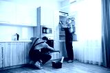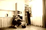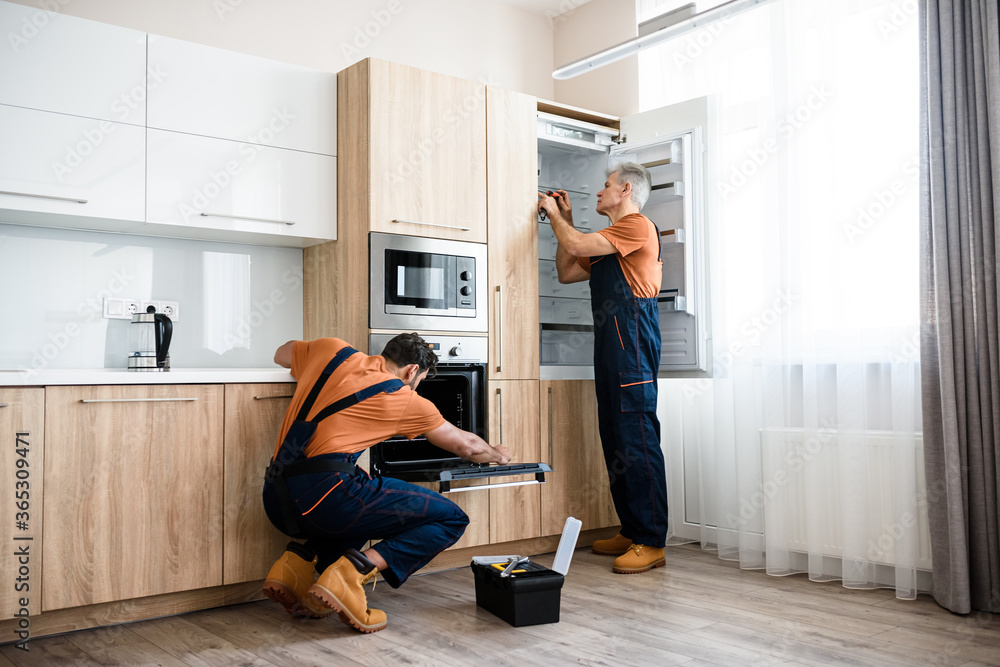Safe and affordable repairs. Two handymen, workers in uniform fixing, installing furniture and equipment in the kitchen, using screwdriver indoors. Furniture repair and assembly concept