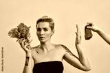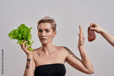 Attractive tattooed woman with pierced nose refuses to eat meat offered to her, choosing fresh green lettuce isolated over grey background