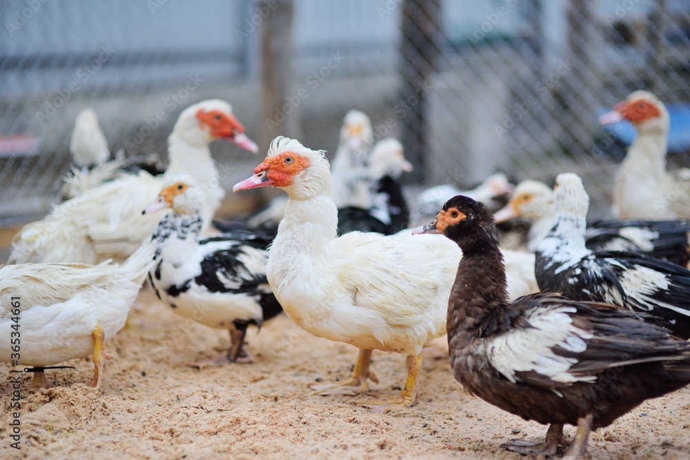 a flock of black and white musk ducks walk on the sand in the poultry yard against the background of a poultry farm.