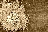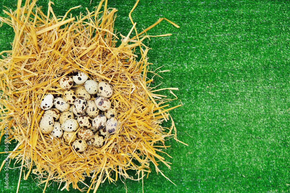 quail eggs in a nest of hay on a background of green grass. Space for text, copy space