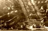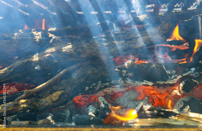 Ray of sunshine through burning firewood metal grill. Soft focus.