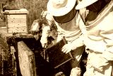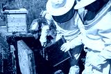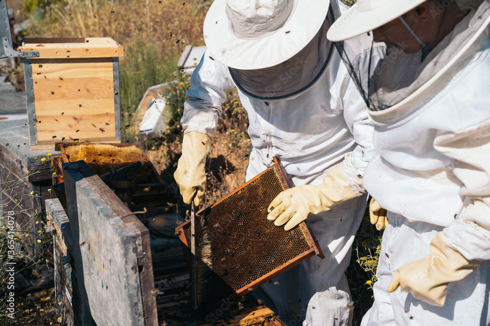 Beekeepers working to collect honey. Organic beekeeping concept.