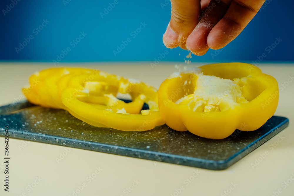 man's hand puts salt on slices of sweet pepper, blue background