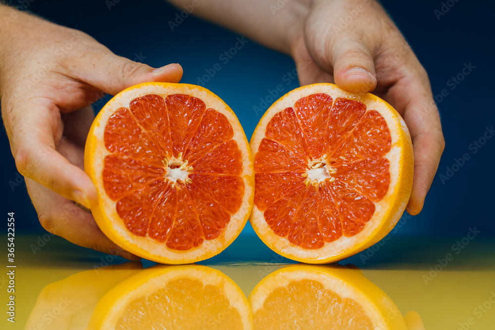 pink grapefruit cut in half. Ripe half of pink grapefruit citrus fruit, sliced grapefruit on blue background,
