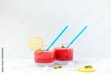 Watermelon smoothie in clear glass glasses with lemon slices on a light background. The concept of light, summer, healthy food.