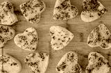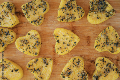 Polenta with herbs cut in heart shape placed on wooden board