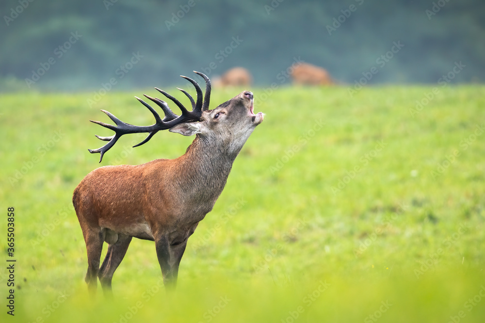 Majestic red deer, cervus elaphus, roaring on meadow in autumn nature. Magnificent stag with huge antlers standing on green grass. Wild animal bellowing in rutting season on pasture.