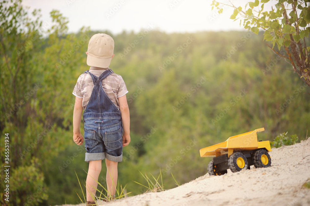 Child, little boy have fun with toy excavator and dumper in the sand. Carefree childhood.