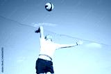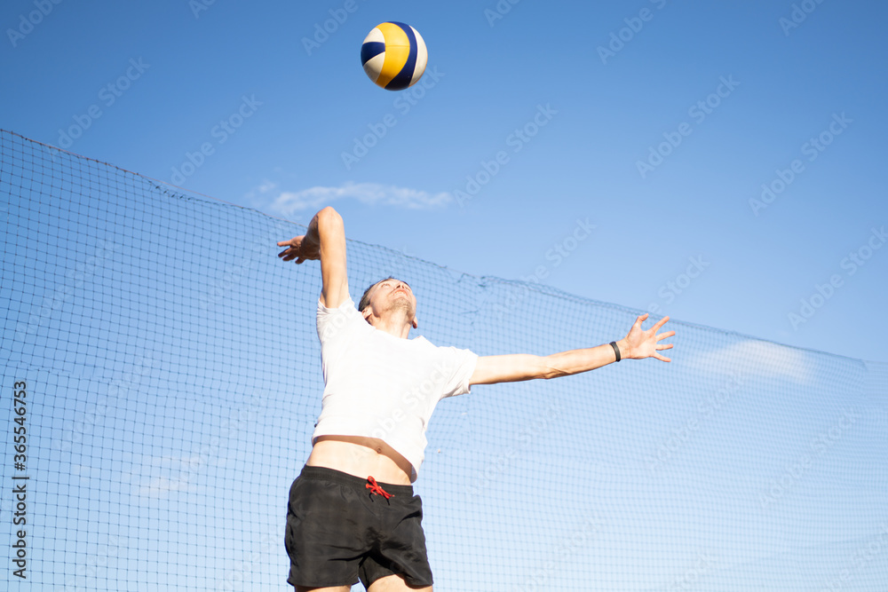 The guy hits the volleyball in the air. Outdoor volleyball game