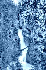 Johnston Canyon Lower Falls at Banff National Park, where the canyon walls are carved steeply into the limestone bedrock by thousands of years of water erosion.