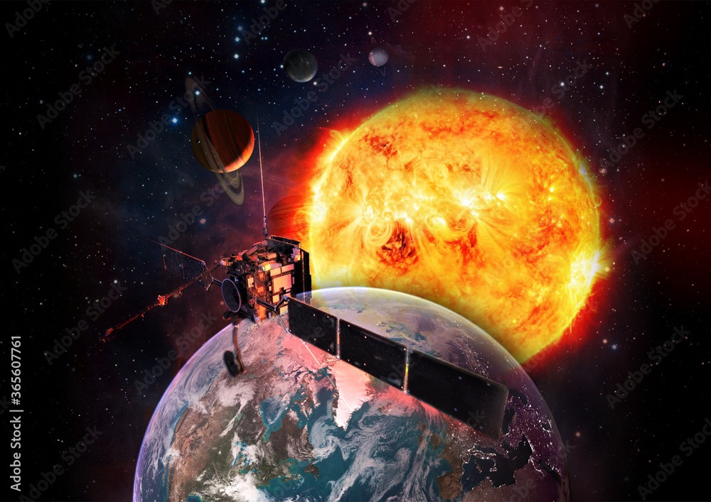 Space travel. Spaceship launch from Earth, mission to the solar system planets. The sun and stars at the background. Elements of this image furnished by NASA.