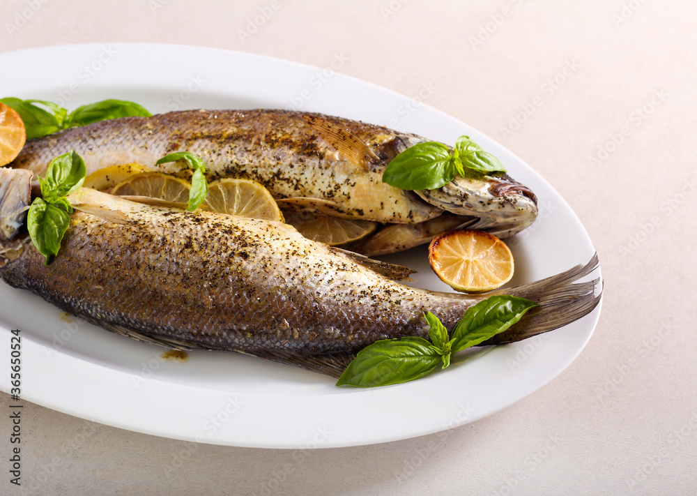 Baked sea bass fish,