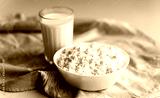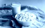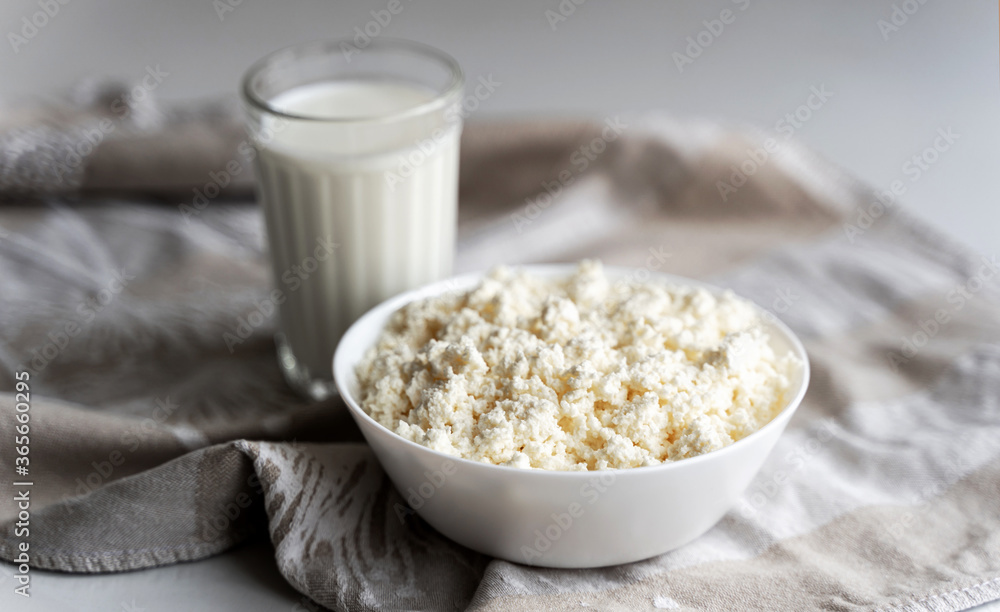 Homemade cottage cheese in a white bowl and a glass of milk on linen towel. Making healthy breakfast food concept. Selective focus