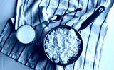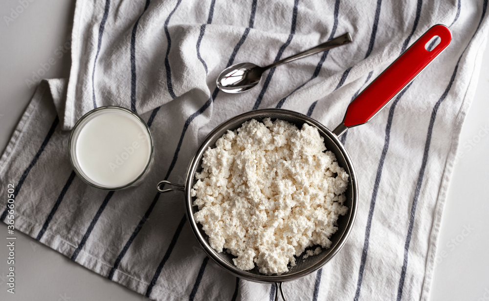Homemade cottage cheese in a metal strainer, milk glass and spoon on linen towel with blue strips. Making healthy breakfast food concept.
