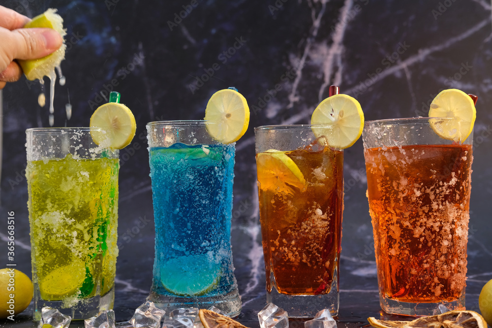 Cool drinks and summer alcoholic cocktail on wood table, space for text