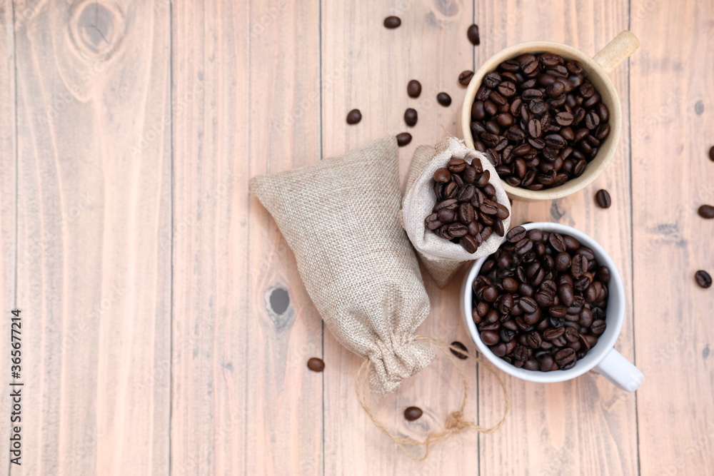 Top view coffee cup and coffee beans on wooden table background and space for text