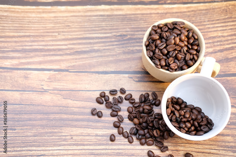 Top view coffee cup and coffee beans on wood table, space for text
