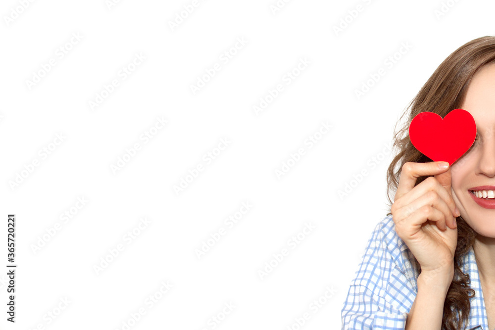 Brunette girl with red hearts wearing boyfriend shirt isolated on white