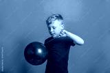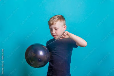 A 6-year-old blond European boy on a blue background in a Studio wearing a black t-shirt. The child is holding a black balloon in his hand and wants to burst. Funny funny boy.